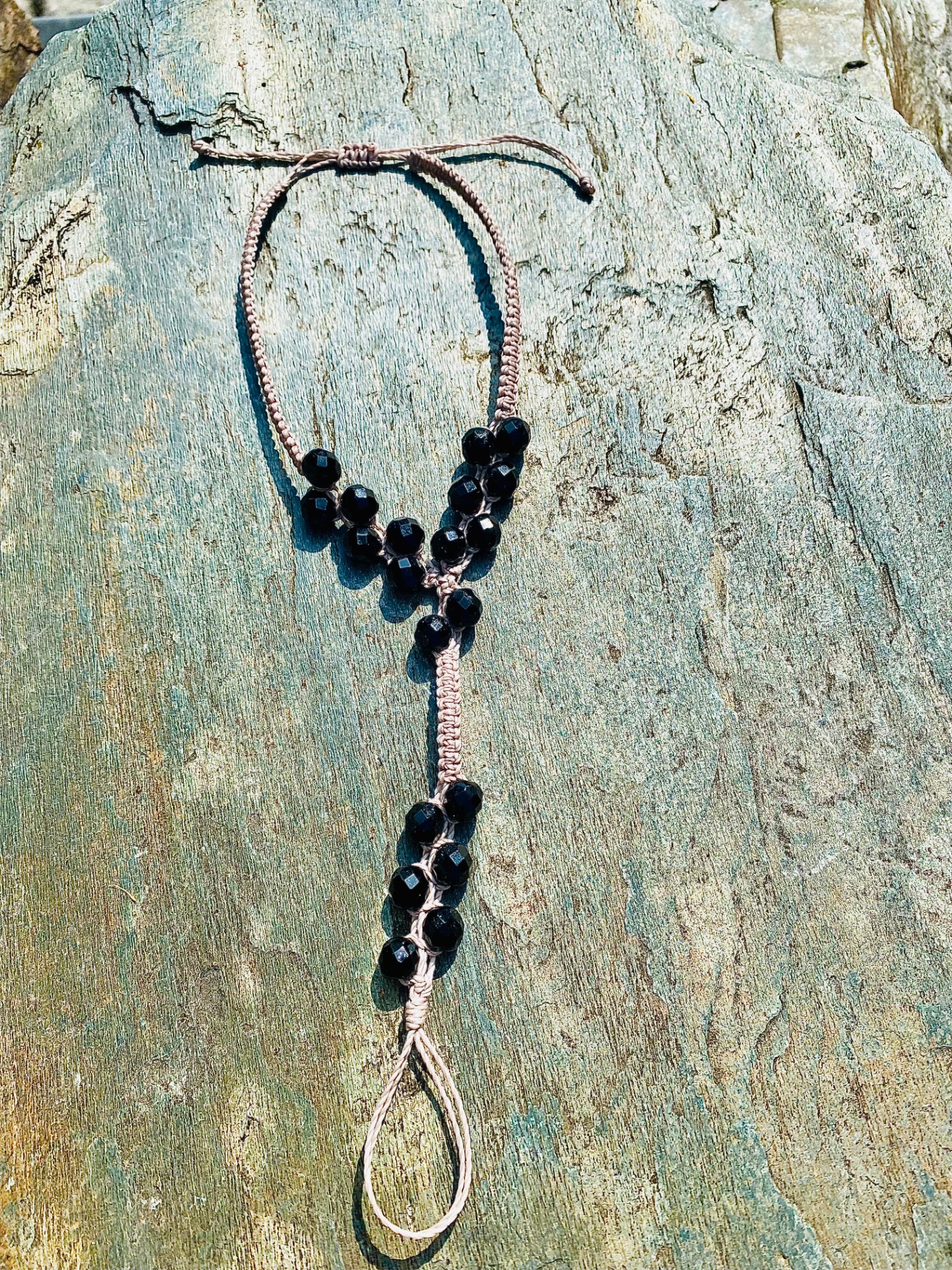 Ručně vázaná technikou micromacramé, s precizně navlečenými broušenými korálky, které nádherně odrážejí světlo. Elegantní, výrazná a přitom jemná – ideální doplněk pro letní večery, festivaly nebo prostě jen pro ten pocit, kdy chceš být jiná.