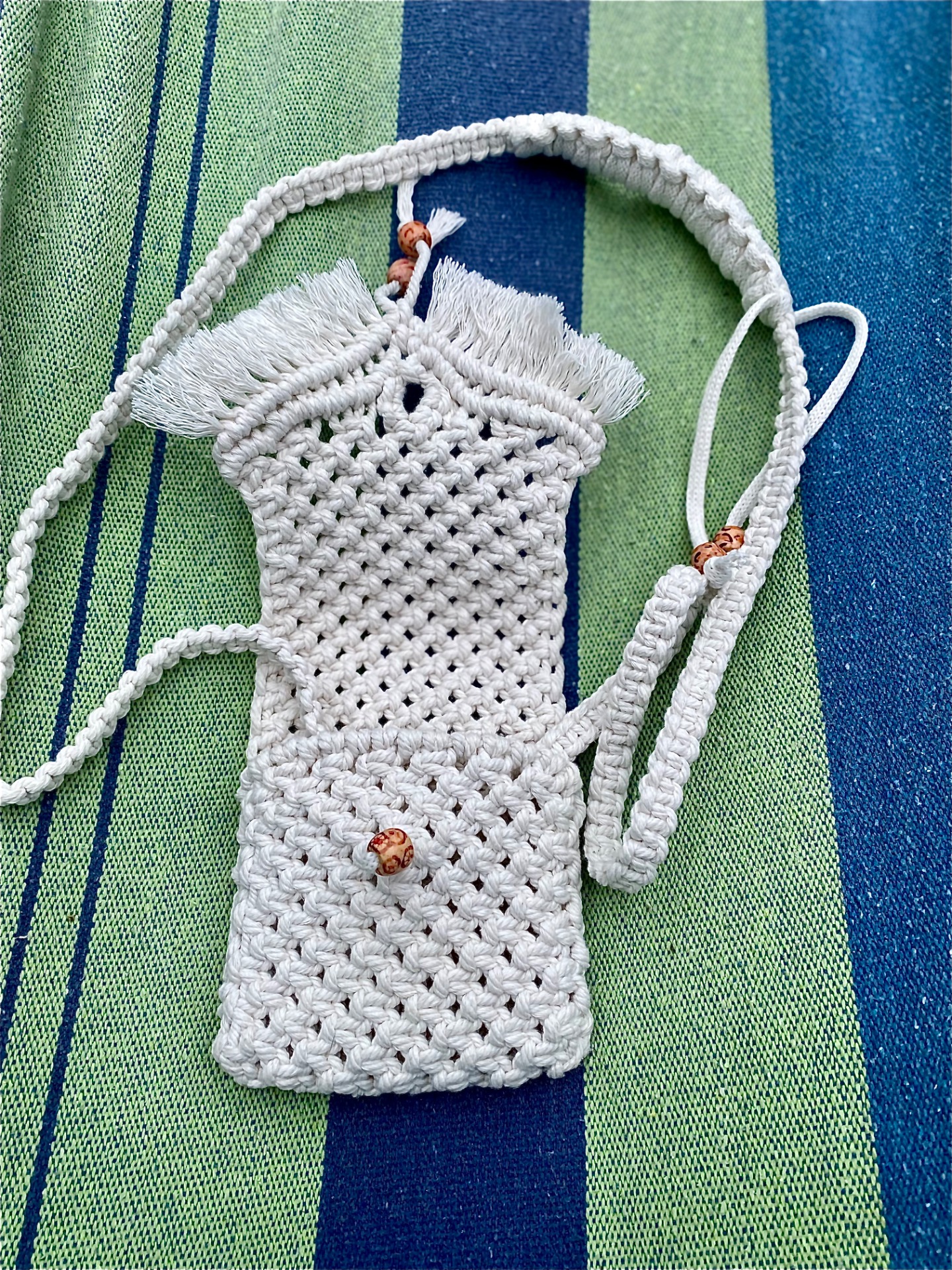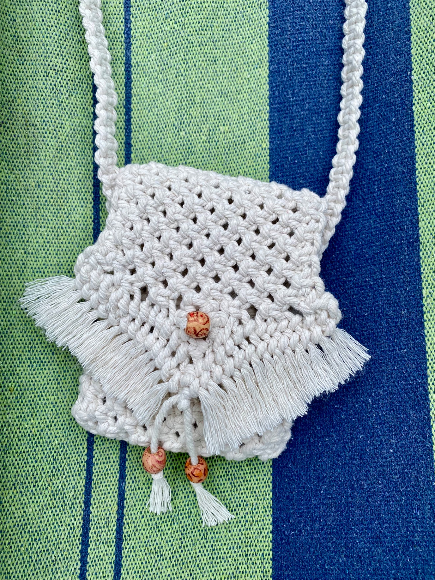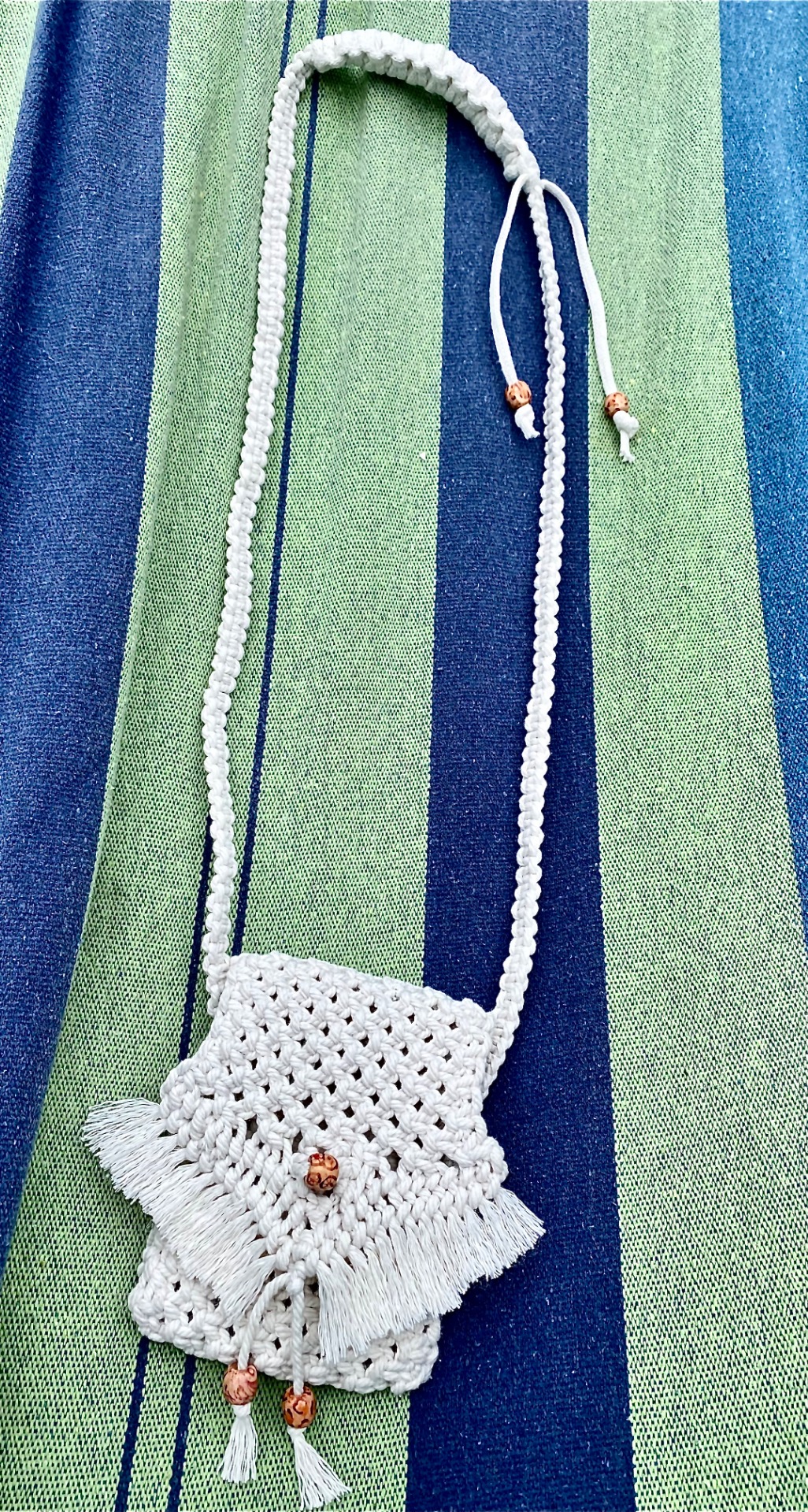 Ručně vázaná taštička technikou macramé inspirovaná postavou Žofie – laskavé, tiché maminky, která v příběhu Prachomilů chrání vzpomínky všech, kteří prožívají něco důležitého.