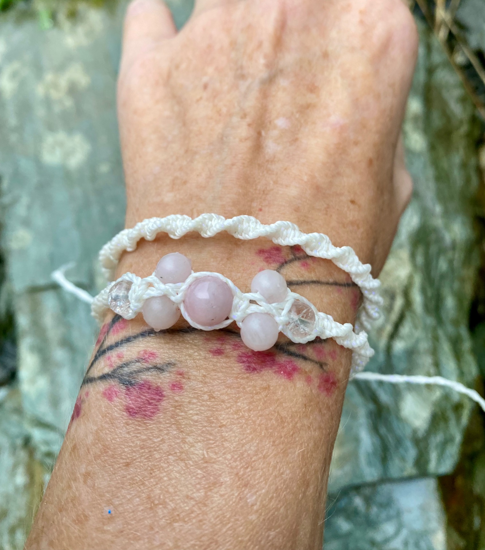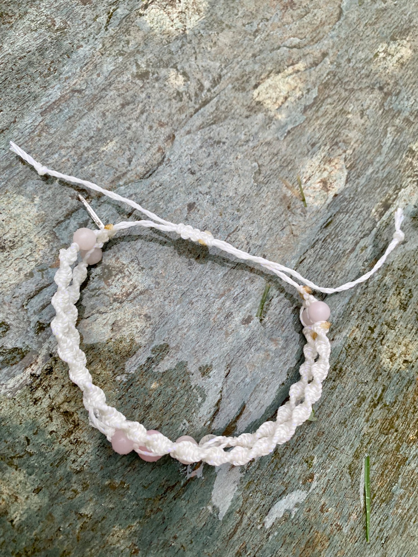 Náramek z růženínu a křišťálu spojený bílou voskovanou šňůrkou symbolizuje ochranu, naději a víru v dobro.