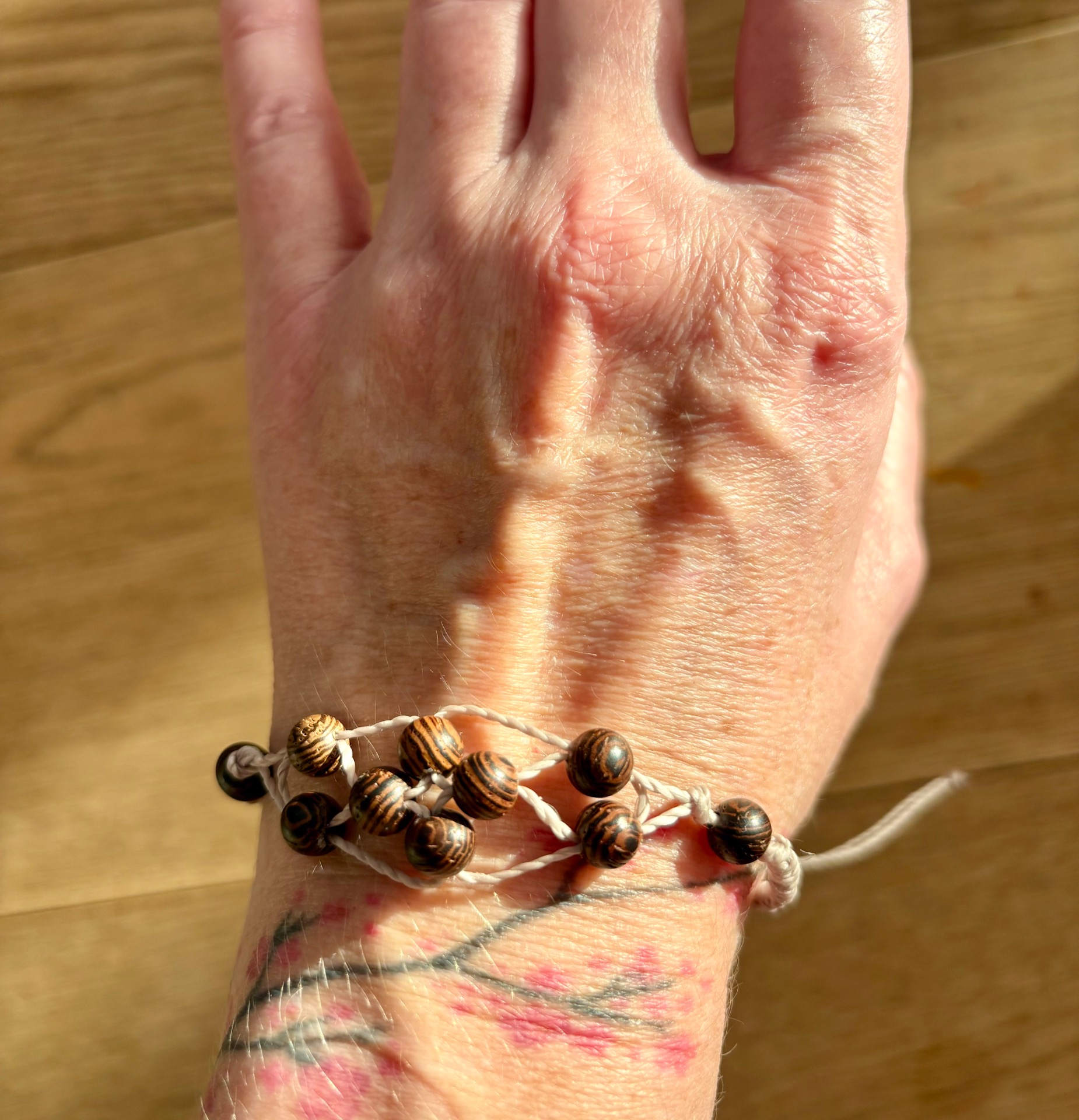 Dominantní část tvoří dřevěné korálky v zemitých tónech, které dodávají náramku přirozený, lehce rustikální charakter.