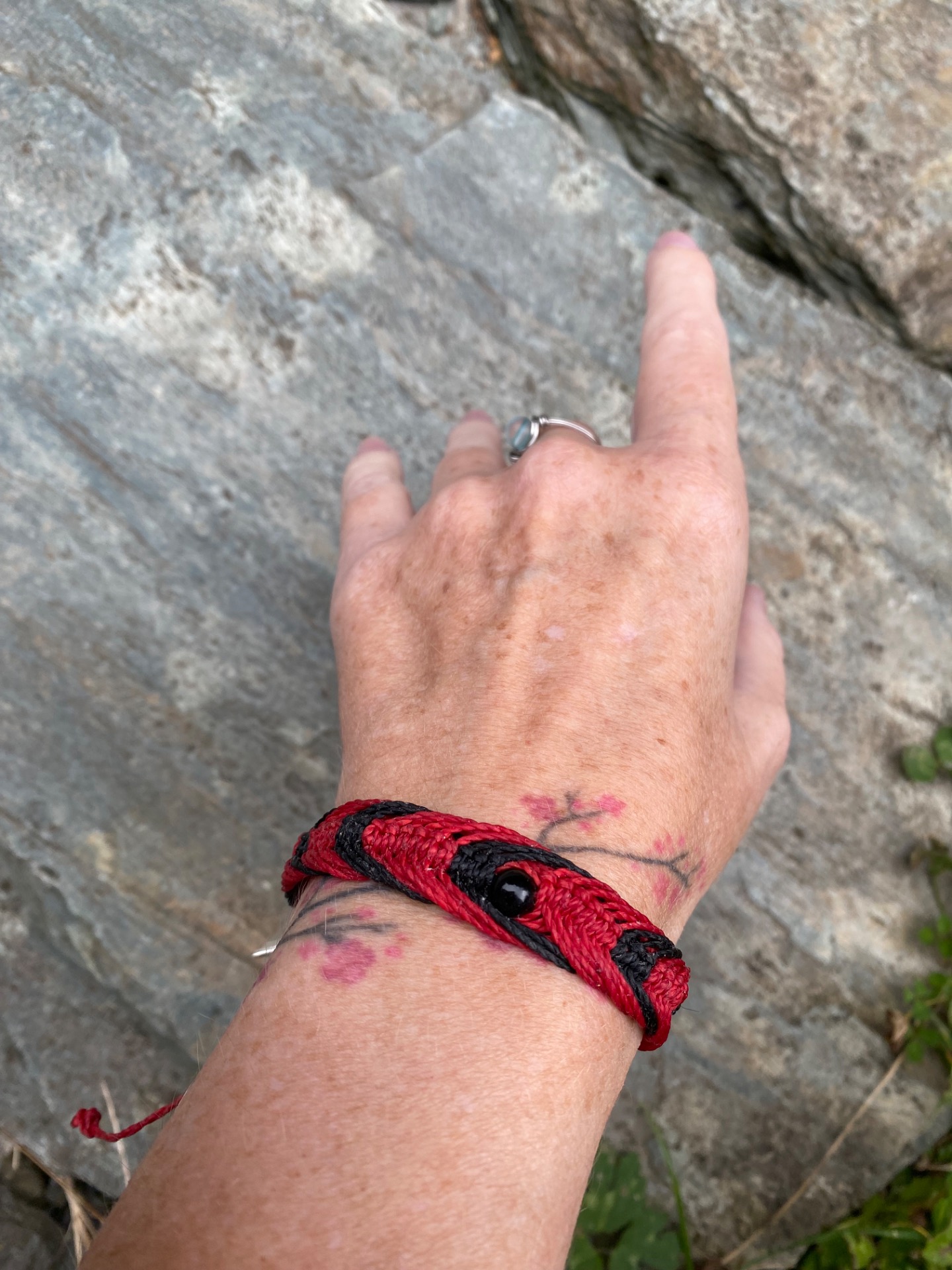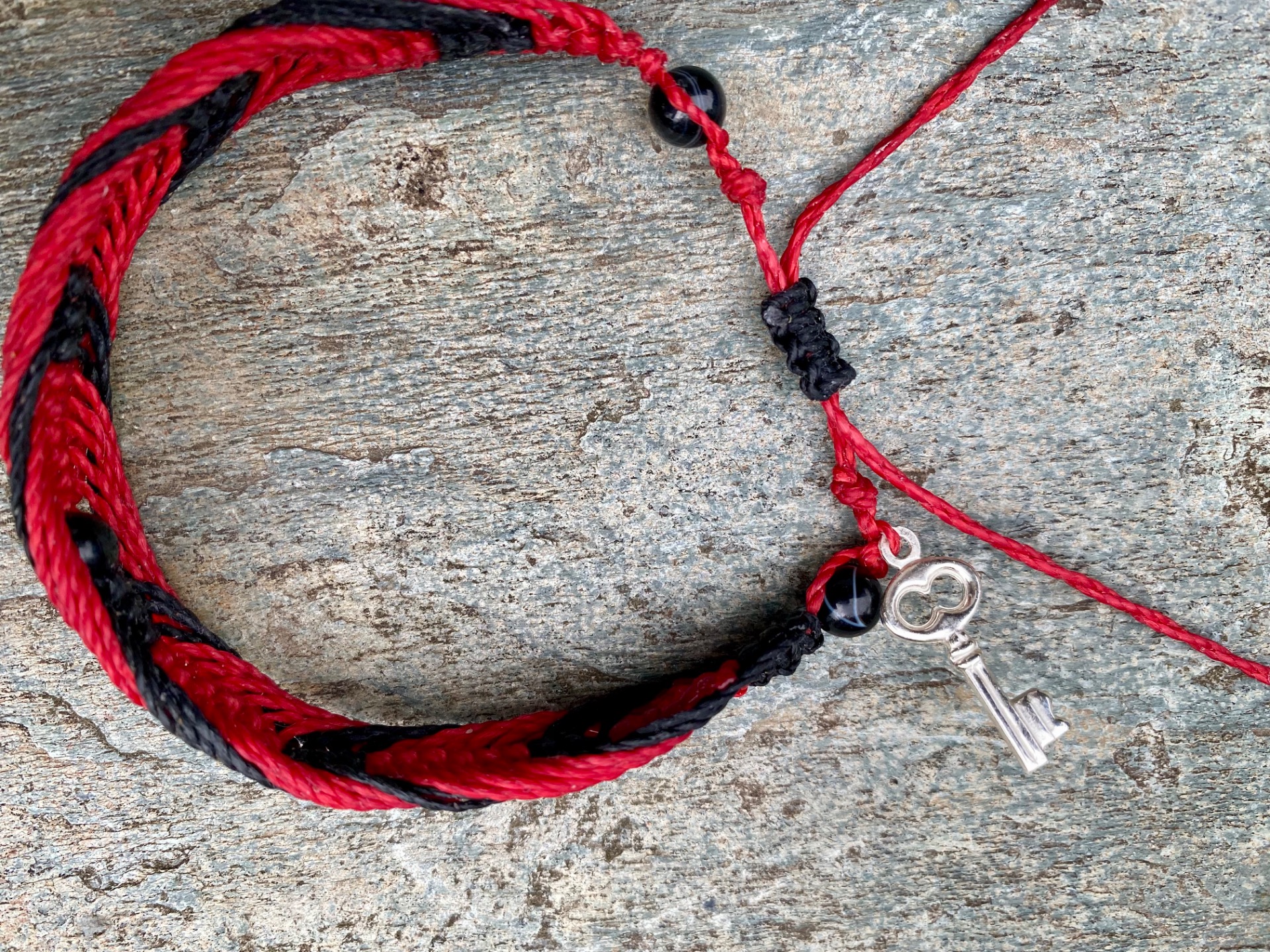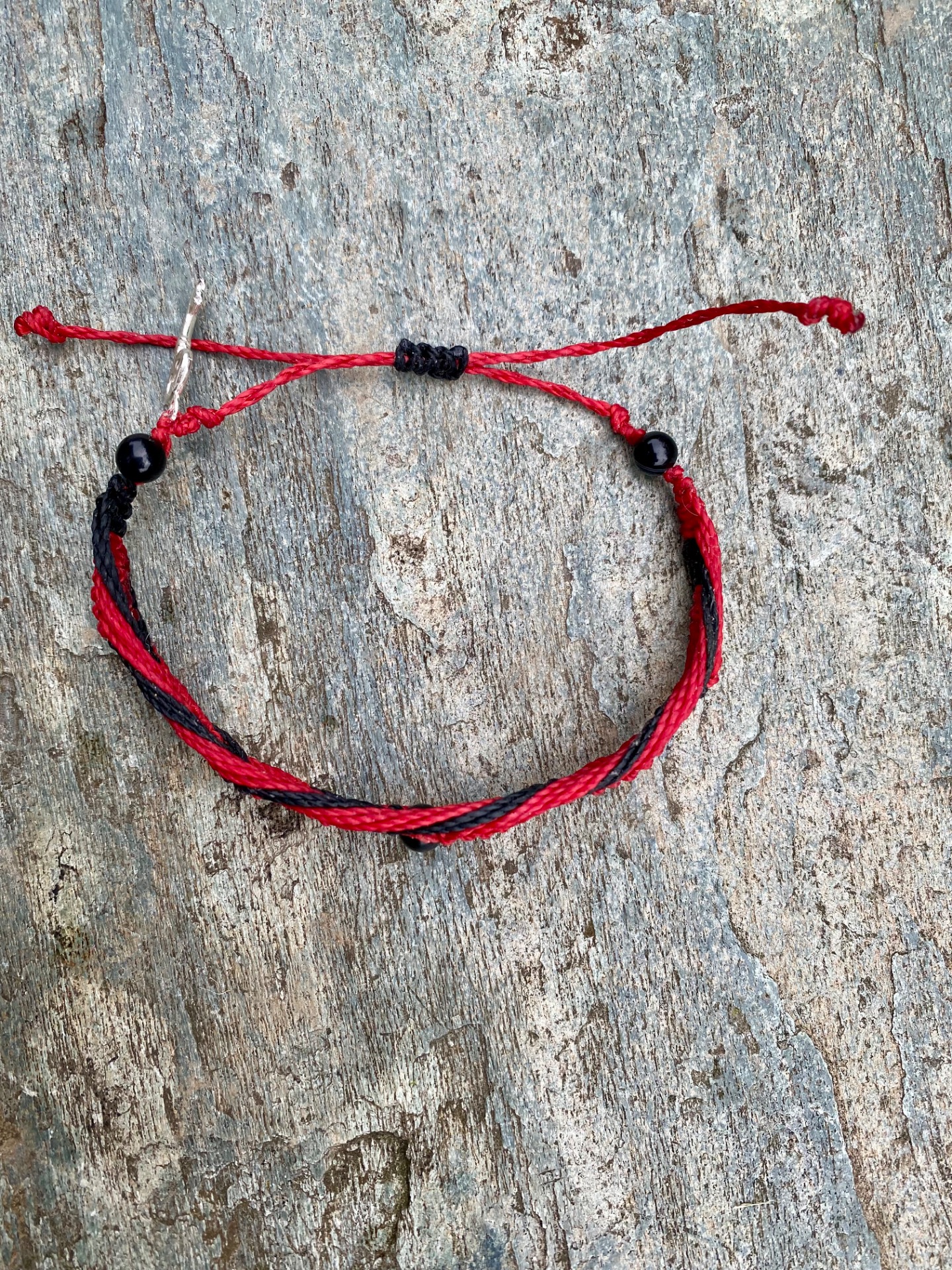 Vyroben z kvalitní voskované šňůrky Linhasita, lehký a příjemný na nošení. Díky posuvnému uzlu se snadno přizpůsobí velikosti zápěstí.