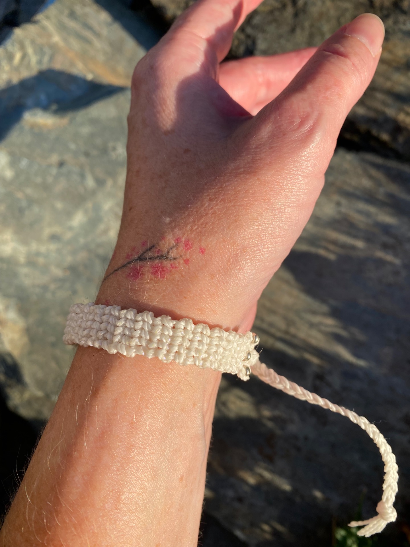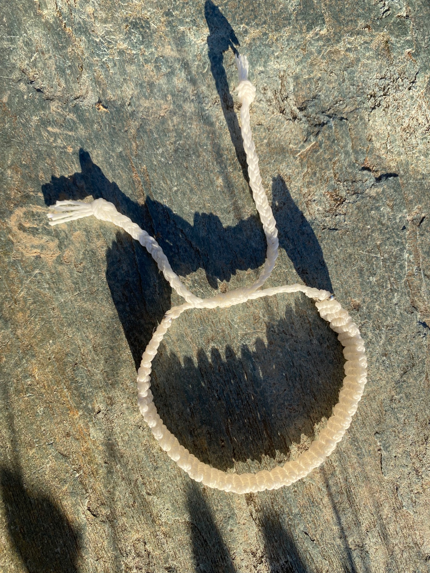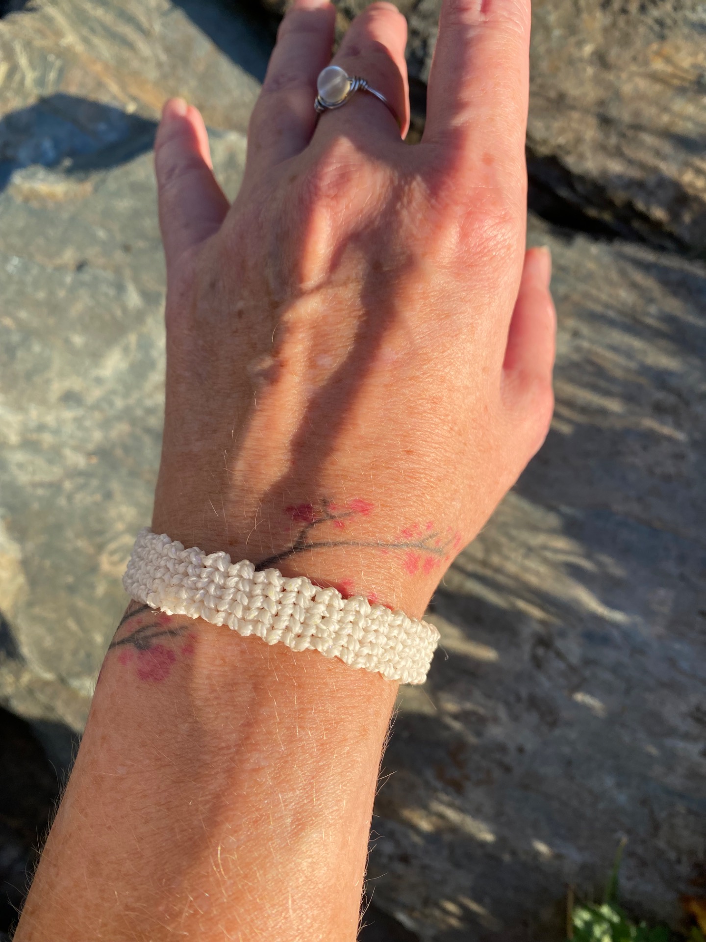 Ručně vázaný náramek technikou mikromacramé ze šňůrky Linhasita v barvě perleťového sněhu. Jemně se leskne, ale drží pevně – jako tiché přání, které si člověk nosí u srdce.