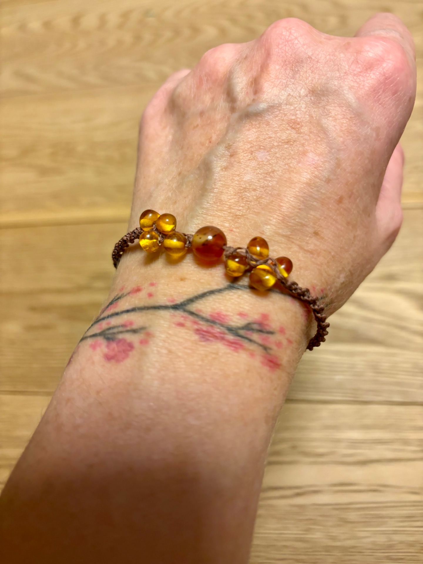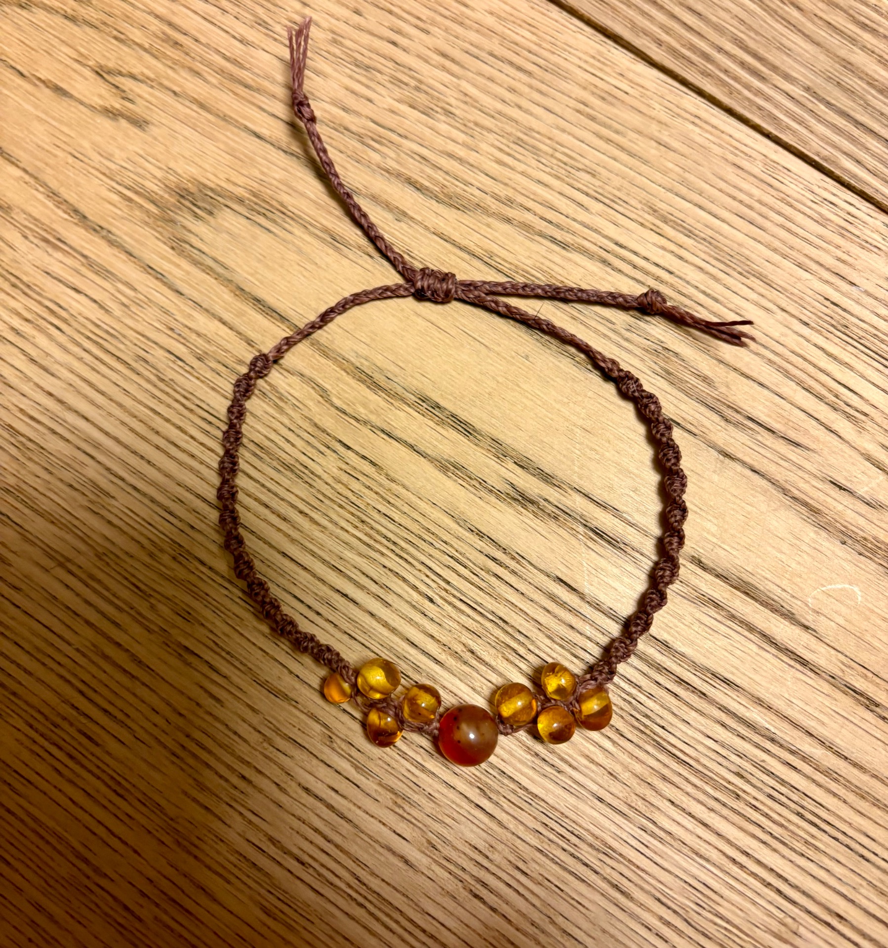 Kombinace karamelově hnědé šňůrky a zlatavých korálků vytváří dojem kapek světla, které se usadily na zápěstí.