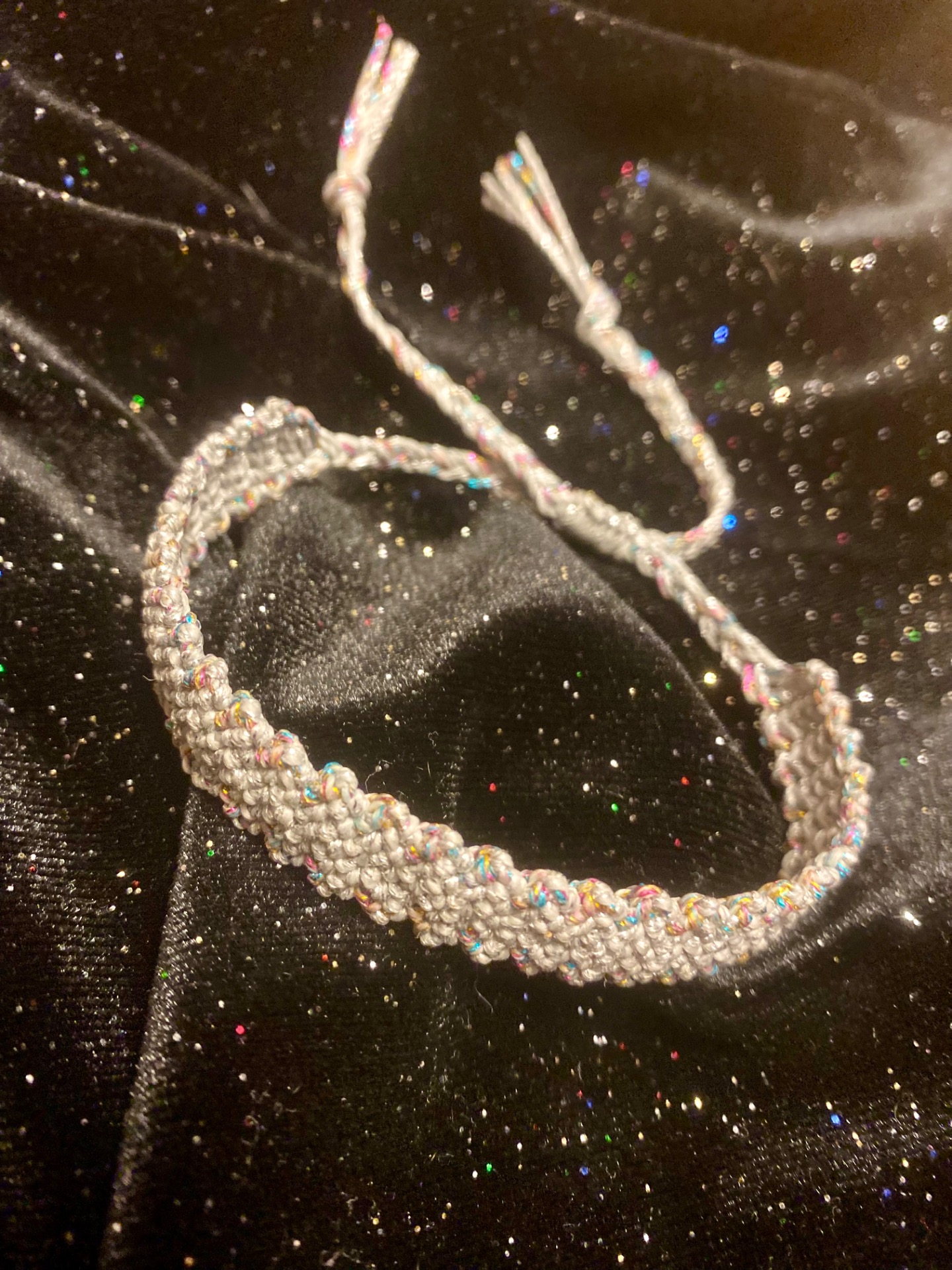 Ručně vázaný macramé náramek v jemném stříbrném tónu s duhově třpytivou nitkou, která připomíná odlesky měsíčního světla na hladině. Elegantní a zároveň hravý doplněk, který se hodí jak k běžnému nošení, tak k výjimečným příležitostem.