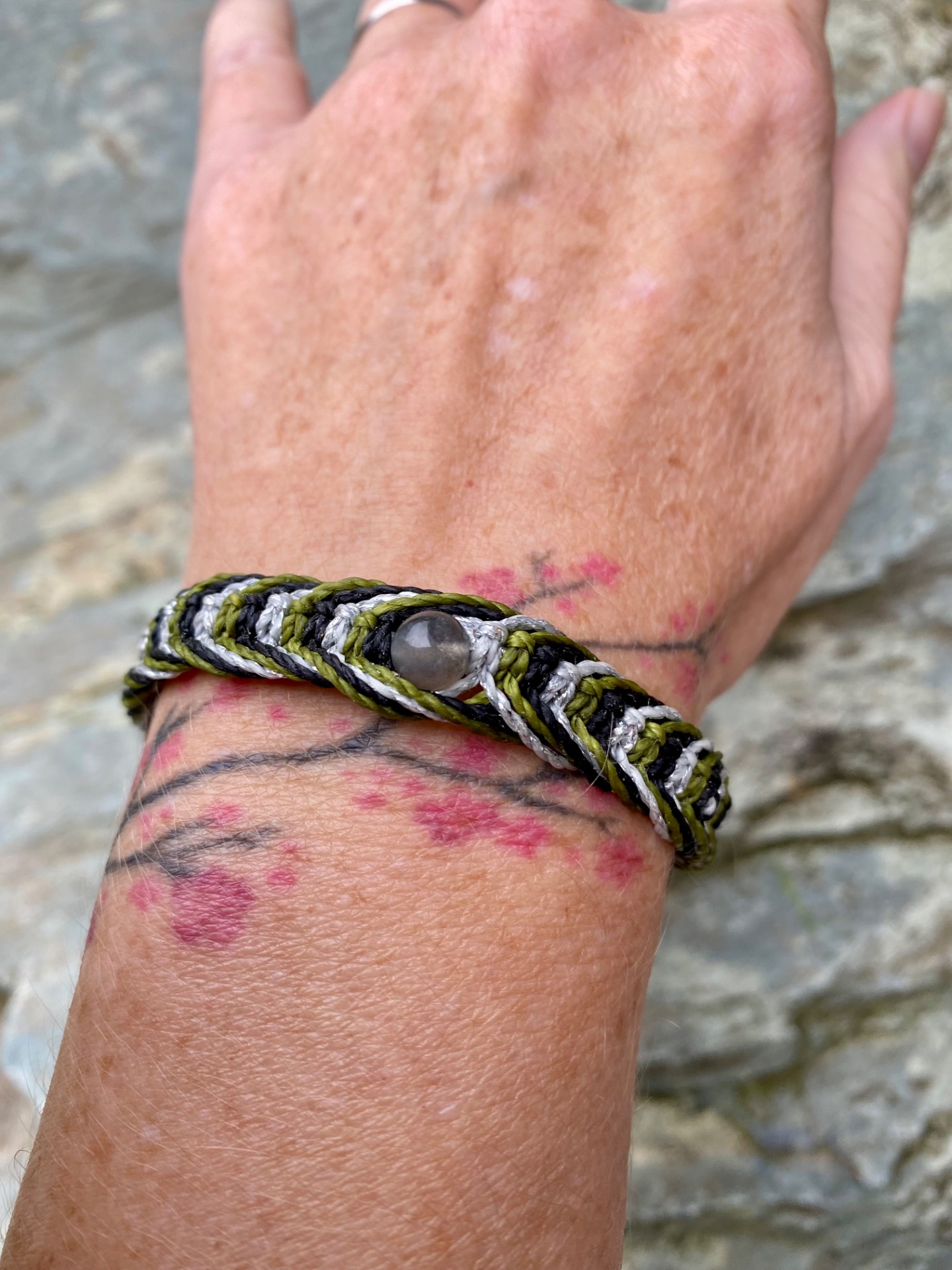 Tento ručně pletený náramek nese sílu chladného klidu a hloubky.