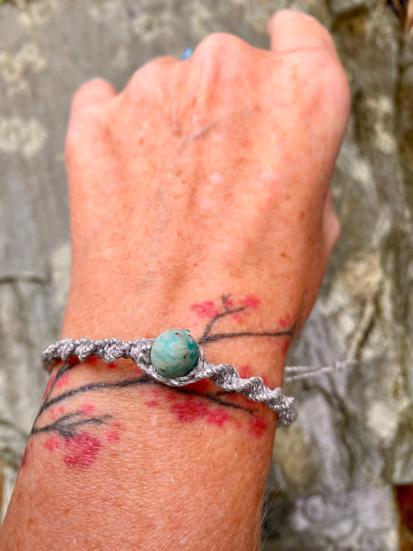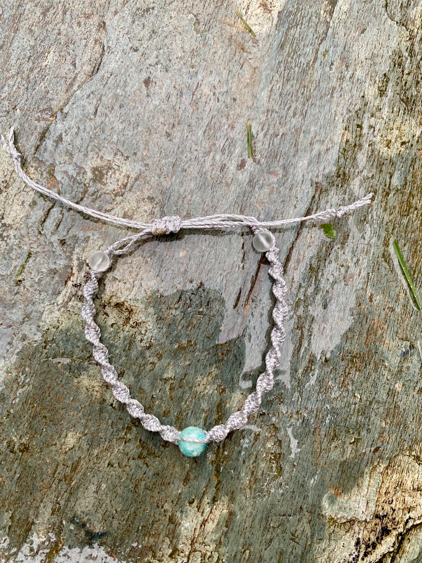 Tento jemný náramek z voskované šňůrky v barvě měsíčního prachu, amazonitu a mléčného křišťálu nese energii klidu, vnitřní rovnováhy a odvahy naslouchat vlastnímu srdci.