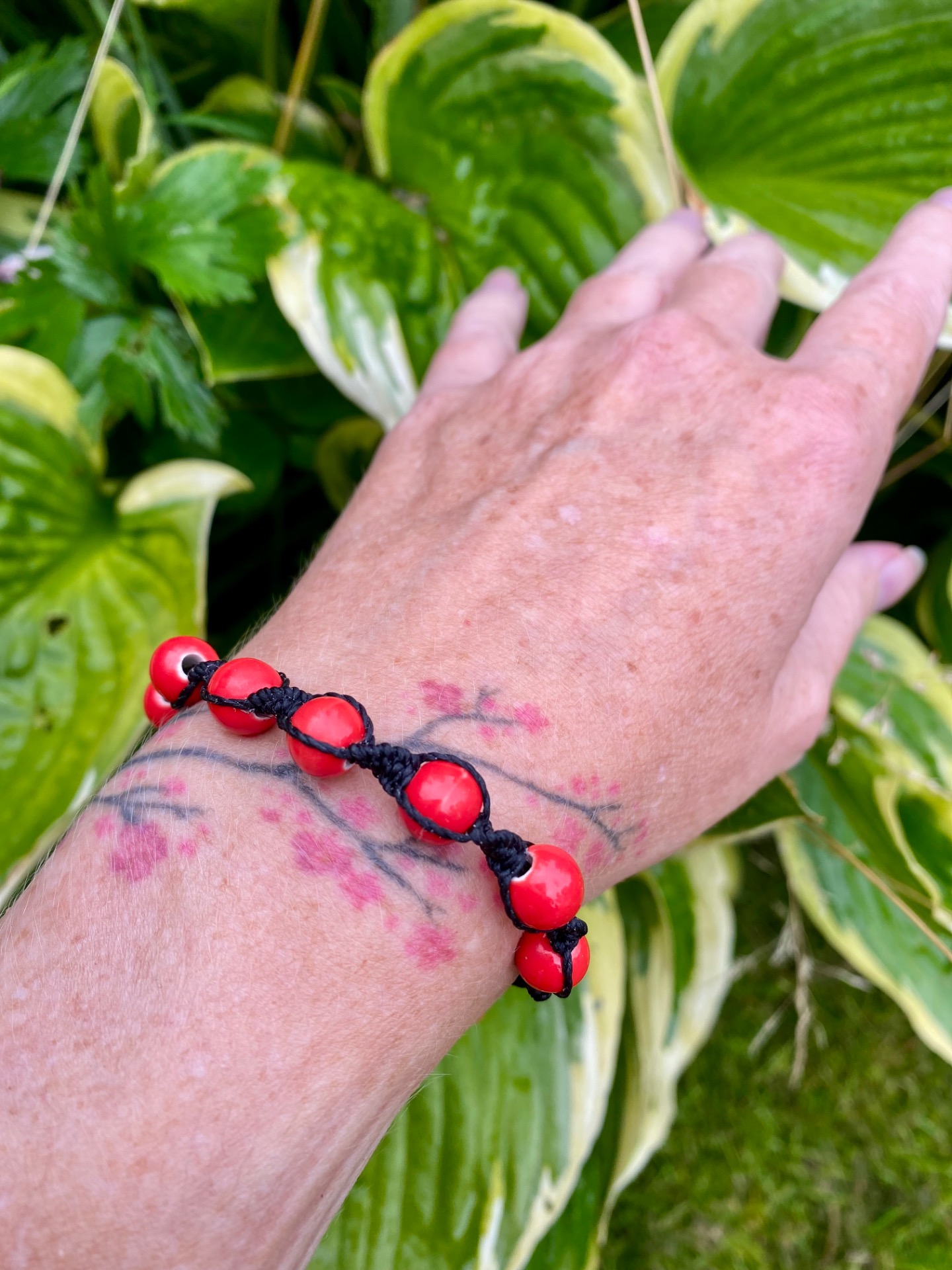 Připomíná sladké léto, kdy ti červené třešně barví prsty a smích zní až do večera. Červené keramické korálky na kontrastní černé voskované šňůrce vypadají jako drobné třešně natrhané potají pod hvězdami.