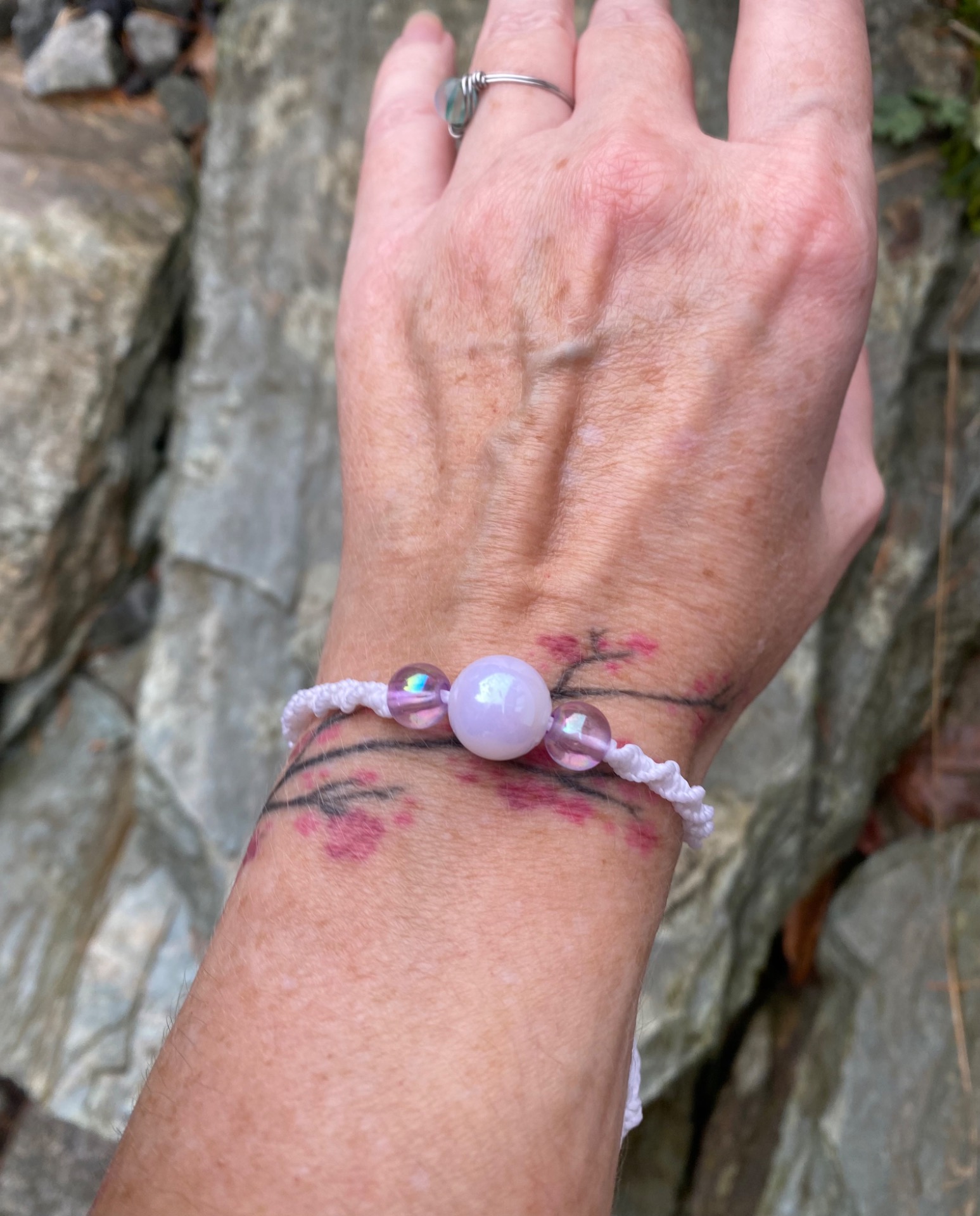 Jemný ručně vázaný náramek z voskované nitě Linhasita v čistě bílé barvě. Doplněn drobnými plastovými korálky s perleťovým leskem, které se třpytí v odlescích růžové a fialové.