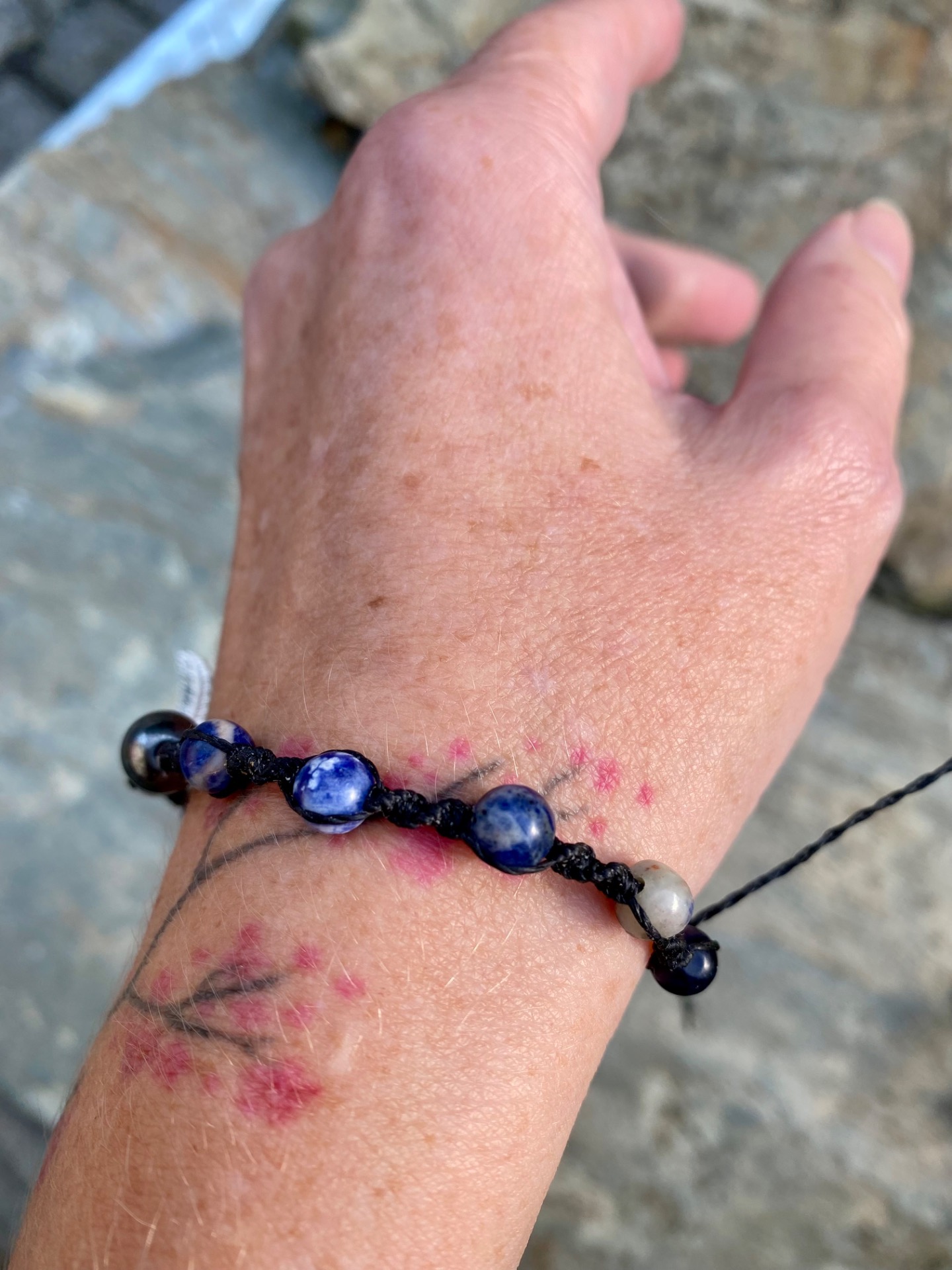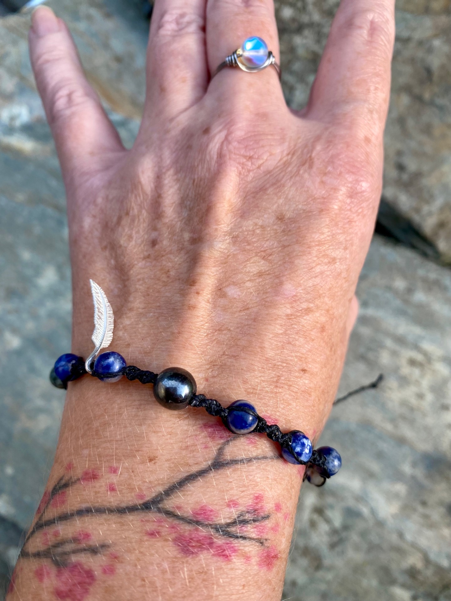 Spojuje černou hloubku ticha, tmavě modrou sílu sodalitu a chladný lesk stříbrného pírka. Jemné tóny hematitu dodávají ochrannou energii a vnáší do náramku pevnost.