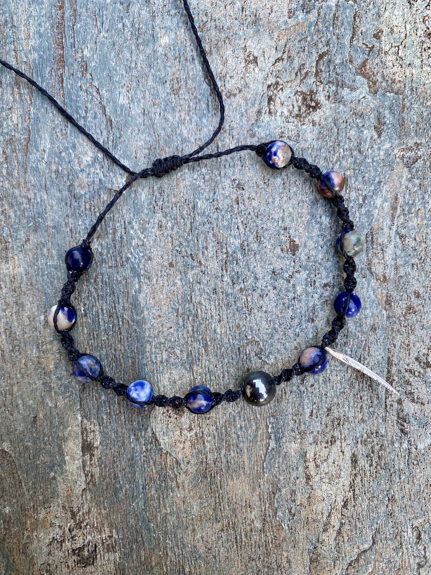 - Materiál: voskovaná šňůrka Linhasita, sodalit, hematit, stříbro