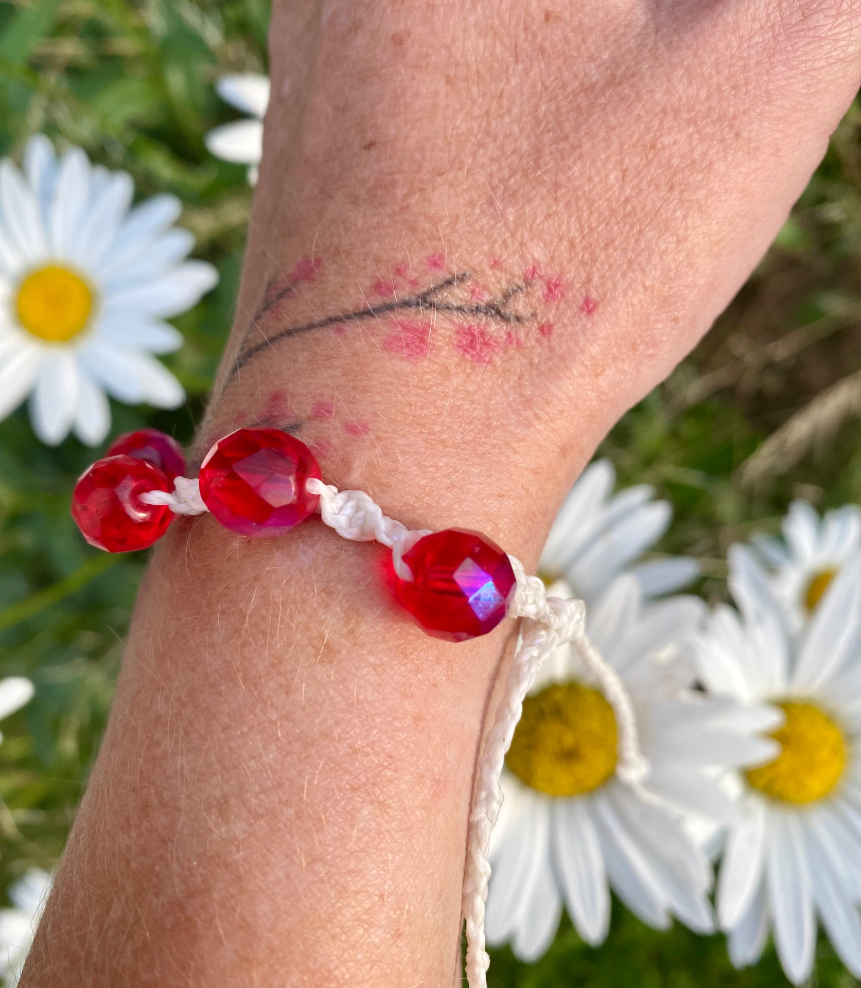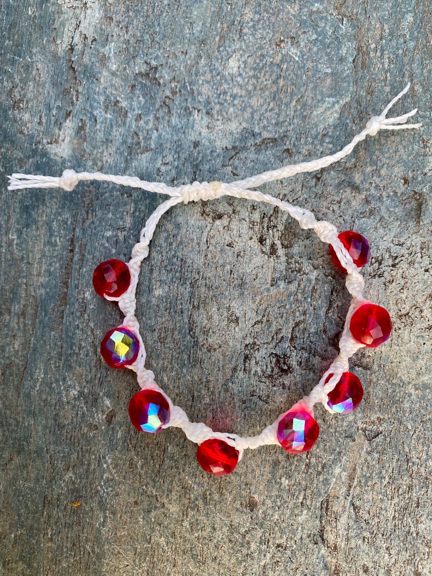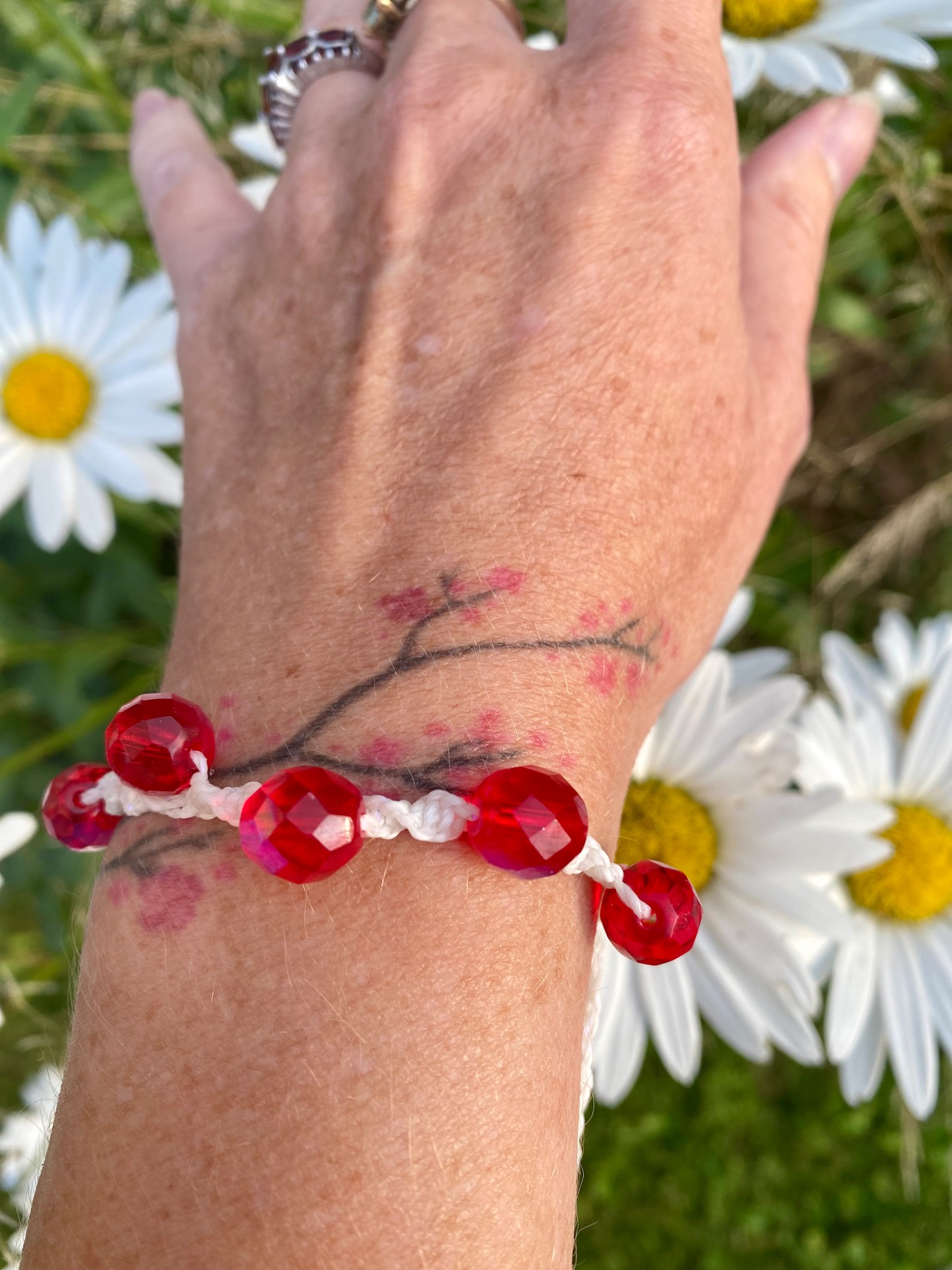 Náramek "Sněhurka" je ručně vyráběný šperk spletený technikou micromacramé z bílé voskované šňůrky, doplněný výraznými broušenými korálky v rudém odstínu. Kontrast bílé a červené barvy připomíná pohádkovou symboliku – pleť bílou jako sníh a rty rudé jako krev. Tento náramek je originálním doplňkem pro každodenní nošení i zvláštní příležitosti. Jemný, hravý a přesto nepřehlédnutelný – šperk, který v sobě nese kouzlo příběhu.