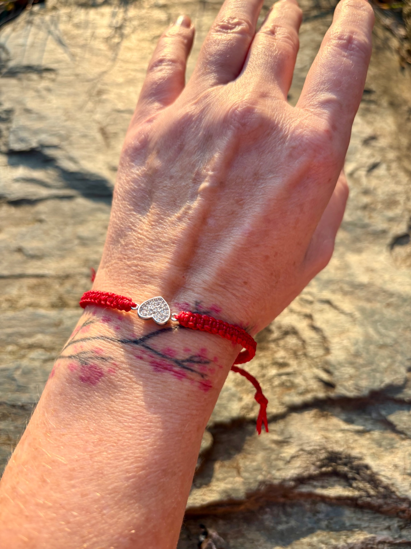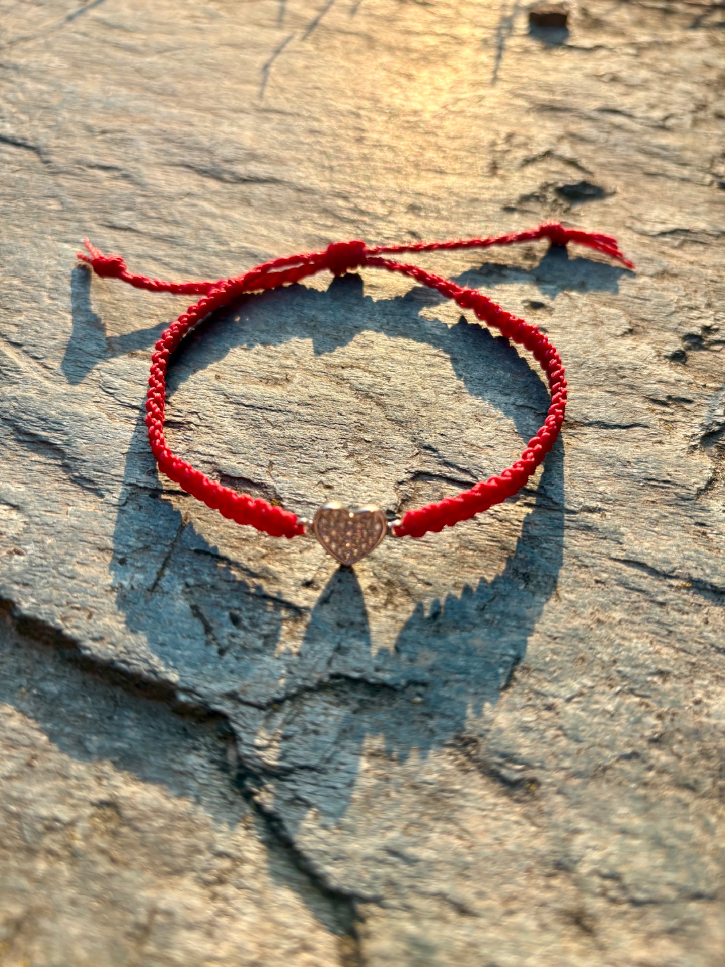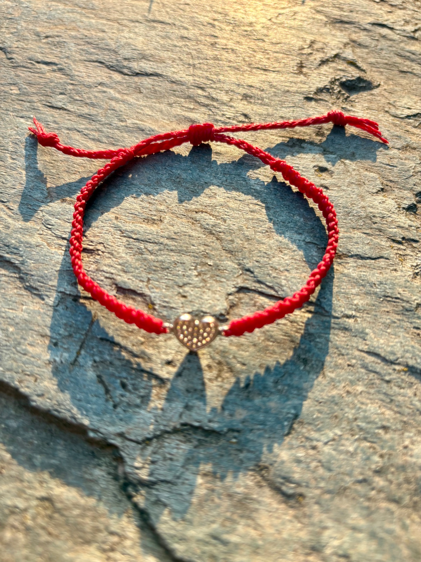 Jemný ručně vázaný náramek se srdíčkem, inspirovaný symbolem červené nitě osudu – neviditelného spojení mezi lidmi, kteří k sobě patří.