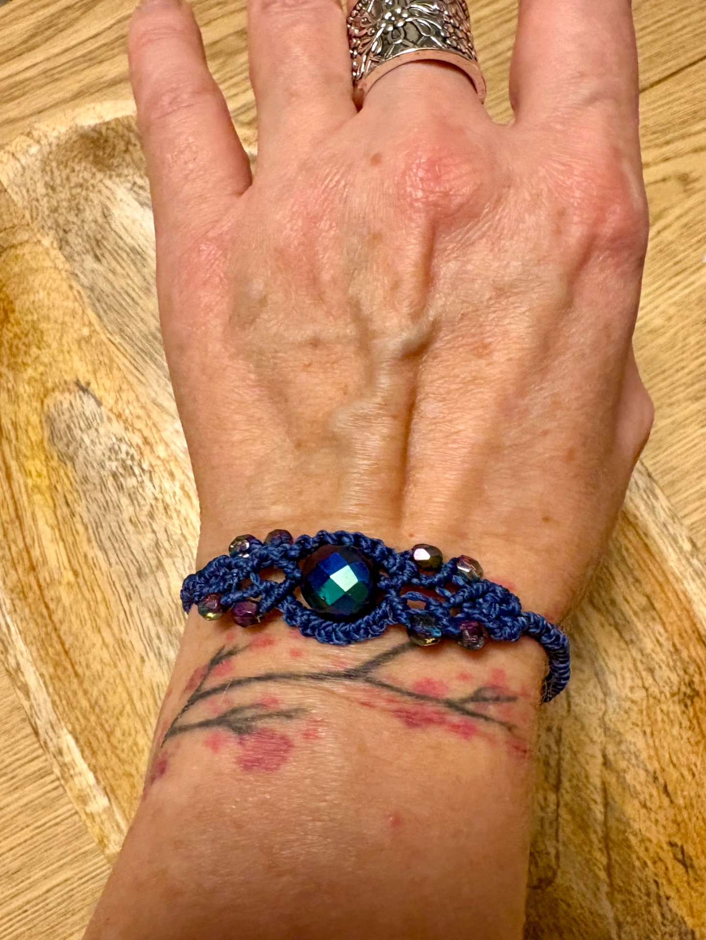 Jemný macramé náramek v hlubokém modrém odstínu, doplněný třpytivými korálky, které připomínají odlesky noční oblohy.