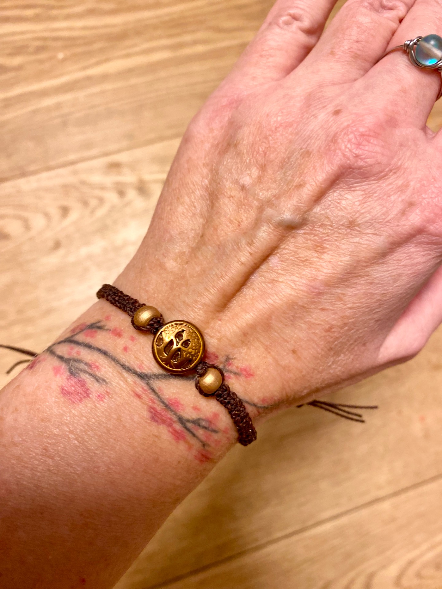 Ručně tkaný náramek z voskované šňůrky Linhasita v hnědém odstínu, doplněný dřevěnými korálky a kovovým symbolem Stromu života – pradávného znamení síly, rovnováhy a spojení se zemí i nebem.