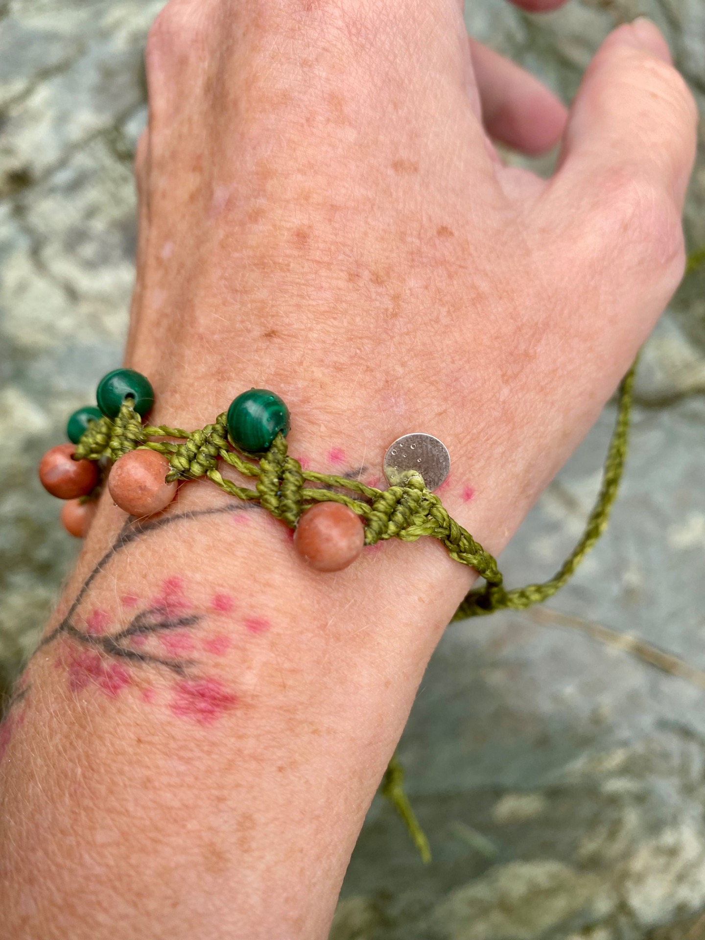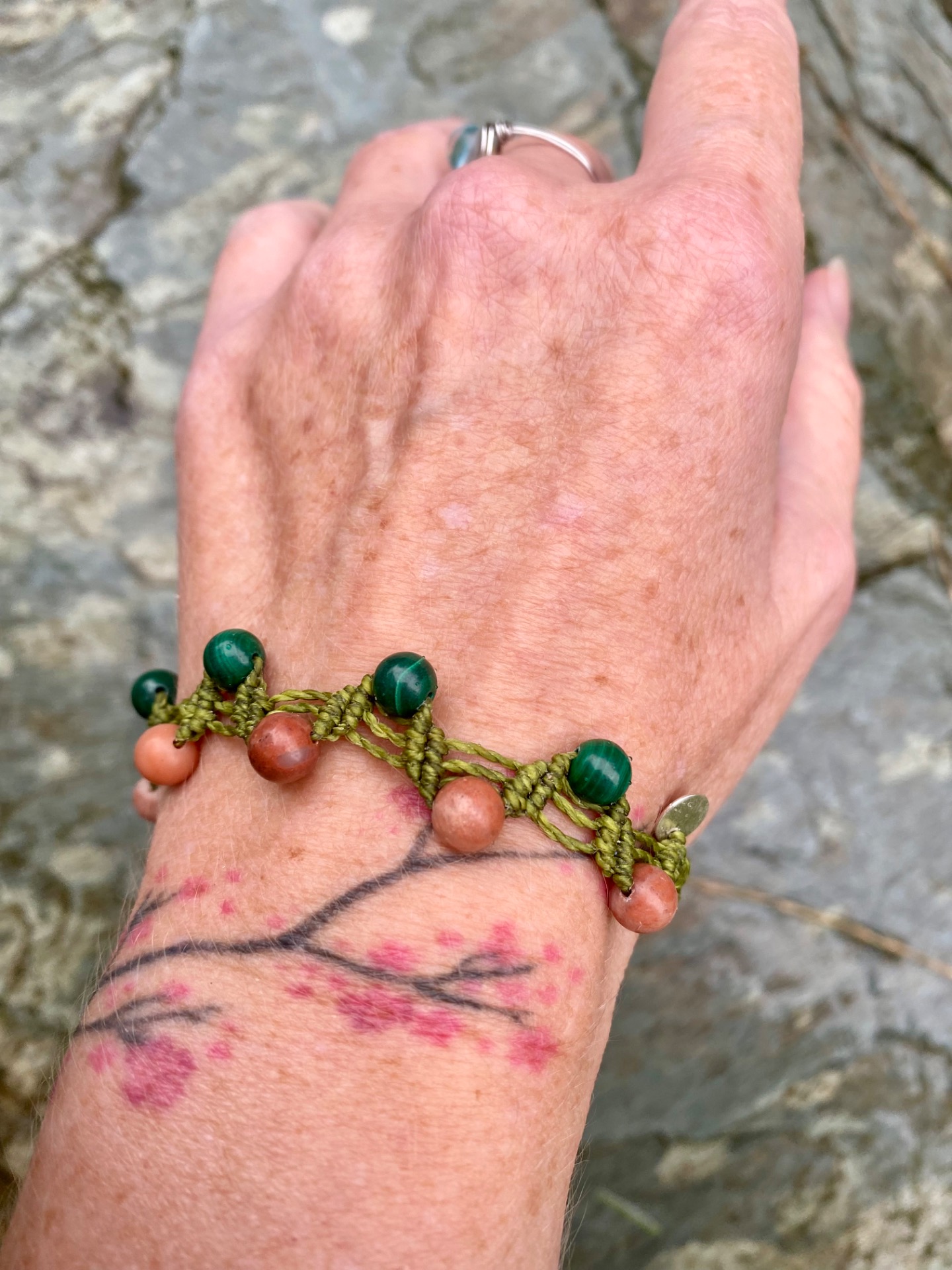 V každém uzlíku se ukrývá síla země, klid stromů a teplo slunce. Kombinace zeleného malachitu a oranžového avanturinu probouzí životní energii, podporuje růst a harmonii.