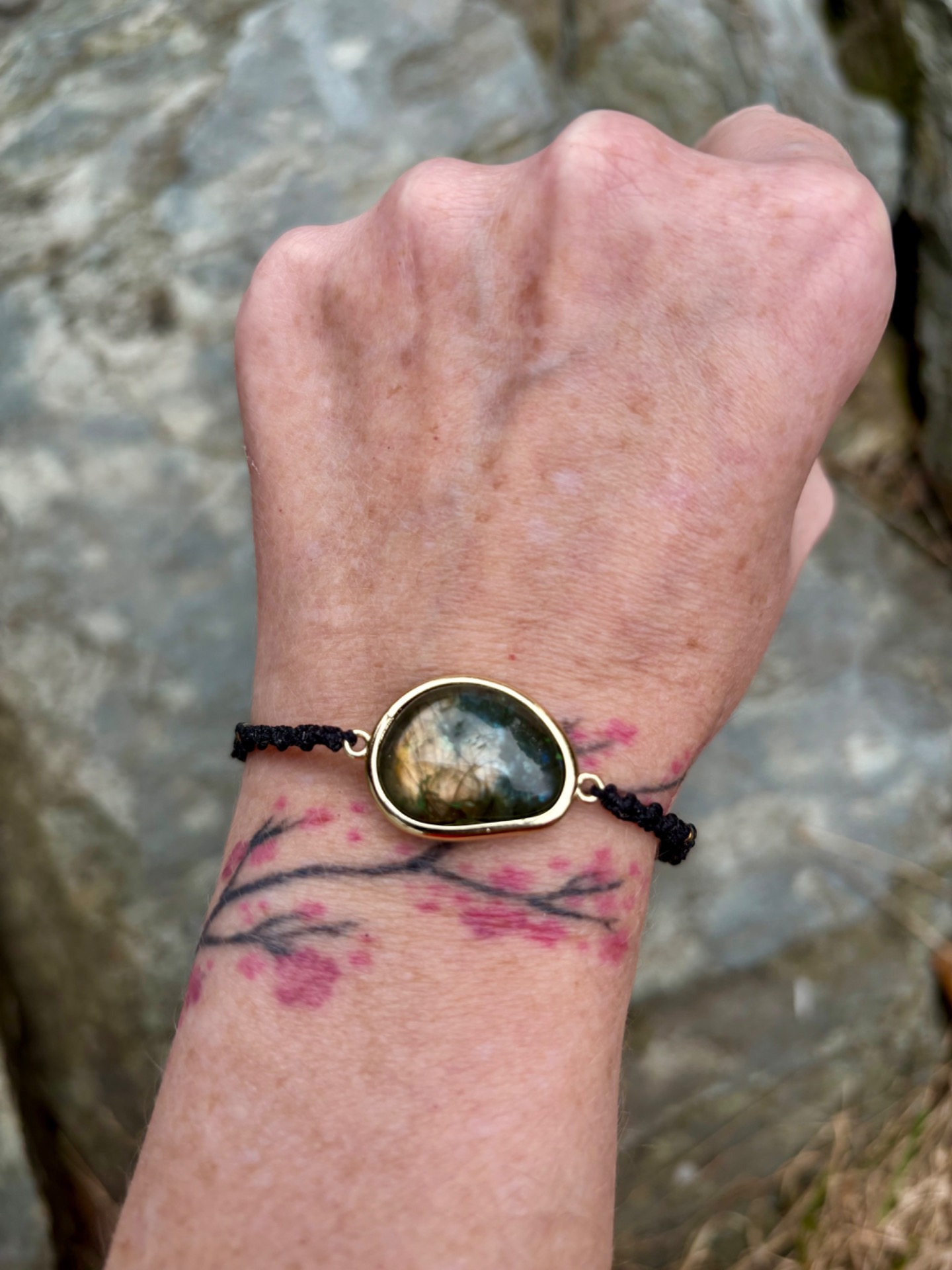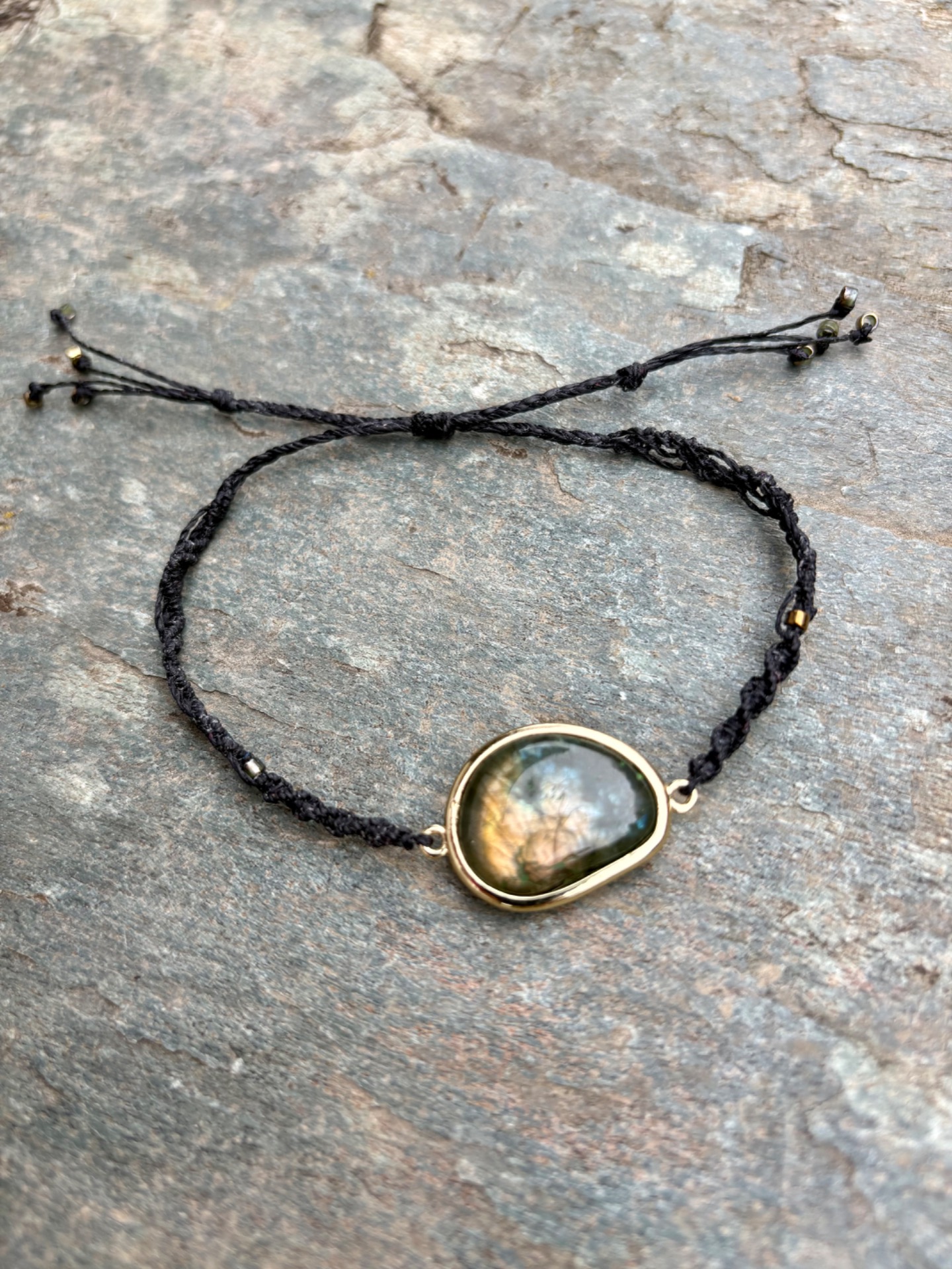 Jemný ručně vázaný náramek s přírodním labradoritem, zasazeným do zlatého rámu.