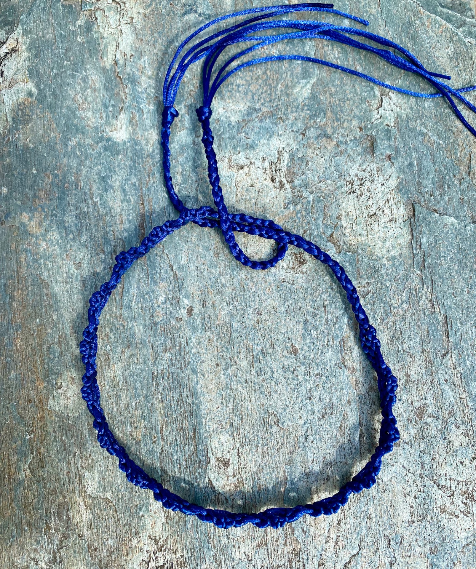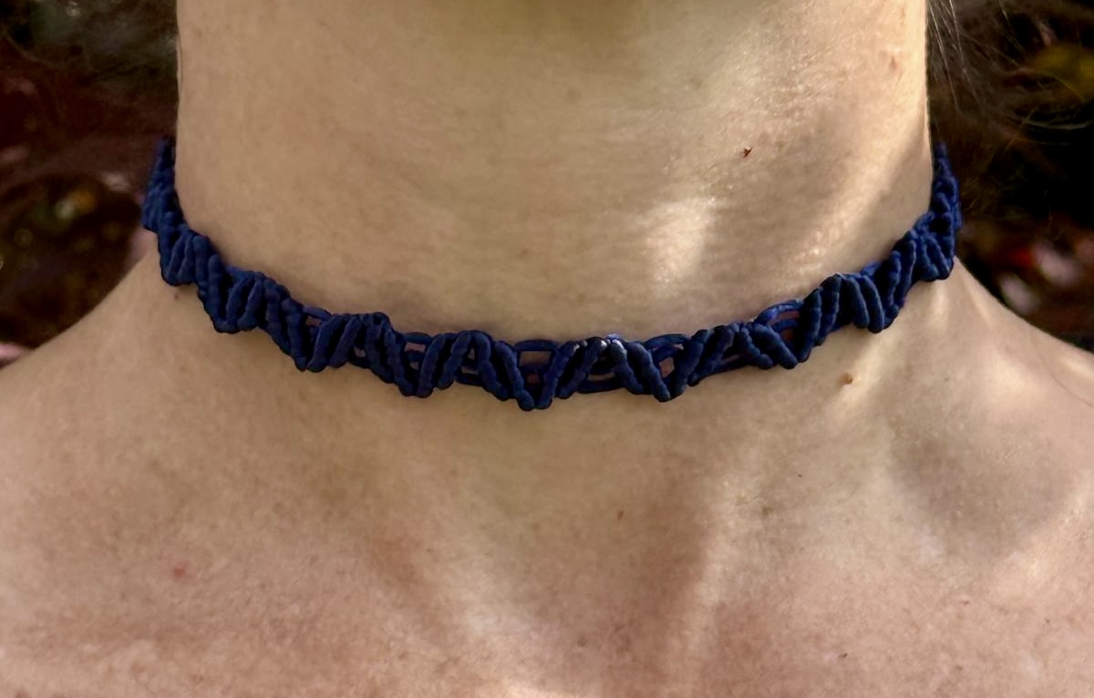 Jemný, ale výrazný – ručně vázaný choker z kvalitní saténové šňůrky v tmavě modré barvě, připomínající noční oblohu. Každý uzlík je veden s péčí a precizností, vzor tvoří mírně plastický efekt, který hezky přiléhá ke krku a zároveň zůstává příjemný na nošení.